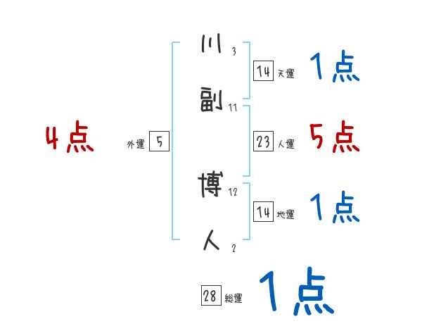 総運![]() | 川副博人さんの総運は28画の1つ星!家庭環境に注意。スポーツで活躍できる能力があるかも。 あなたの人生を表す1番重要な運勢です。生涯を通じて影響する総合運となり、主に50歳以降の晩年期に影響を及ぼします。 |