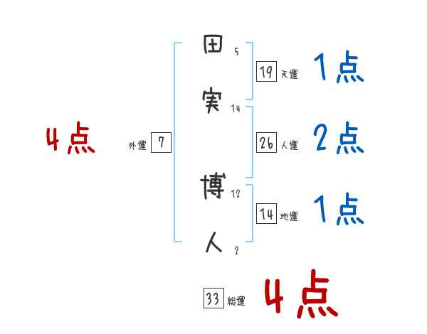 総運![]() | 田実博人さんの総運は33画の4つ星!権力志向でプライドが高い。勇気があり運を切り開き成功する。 あなたの人生を表す1番重要な運勢です。生涯を通じて影響する総合運となり、主に50歳以降の晩年期に影響を及ぼします。 |