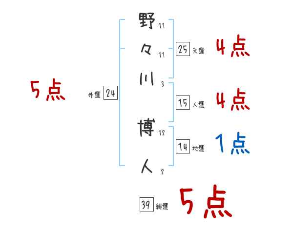 天運![]() | 野々川博人さんの天運は25画の4つ星!個性があり才能があふれる。強運の持ち主で発展する。 家系が持つ宿命的な運勢を表します。祖先から受け継いだ苗字ですので自分の力が及びません。家柄を象徴します。 |