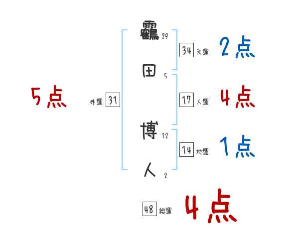 外運![]() | 靏田博人さんの外運は31画の5つ星!社交性があり判断力に優れる。順風満帆な人生で円満な生活。 生活面を象徴する運勢です。外部から受ける影響力を表し、結婚運、家庭運や職場、環境への順応性を表します。 |