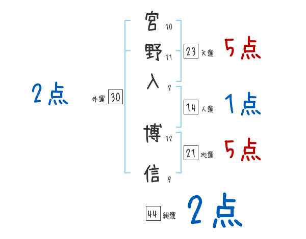 天運![]() | 宮野入博信さんの天運は23画の5つ星!想像力に優れ活力がある。一代で成功し名誉を手に入れる。 家系が持つ宿命的な運勢を表します。祖先から受け継いだ苗字ですので自分の力が及びません。家柄を象徴します。 |