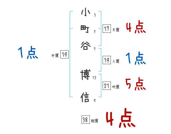 外運![]() | 小町谷博信さんの外運は19画の1つ星!優れた才能を持ちますが、協調性が足りないことも。周りの人と協力する事を意識しましょう。 生活面を象徴する運勢です。外部から受ける影響力を表し、結婚運、家庭運や職場、環境への順応性を表します。 |