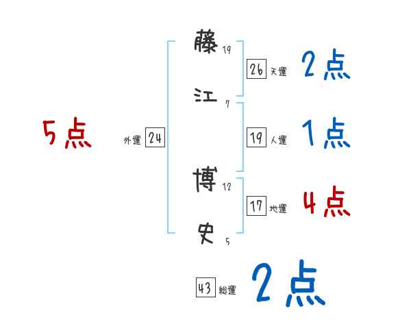 外運![]() | 藤江博史さんの外運は24画の5つ星!家庭運が良く順調な人生。金運にも恵まれる。 生活面を象徴する運勢です。外部から受ける影響力を表し、結婚運、家庭運や職場、環境への順応性を表します。 |