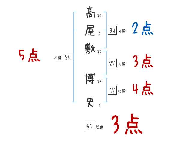 総運![]() | 高屋敷博史さんの総運は51画の3つ星!変化が激しく、危険に注意。堅実な性格。 あなたの人生を表す1番重要な運勢です。生涯を通じて影響する総合運となり、主に50歳以降の晩年期に影響を及ぼします。 |