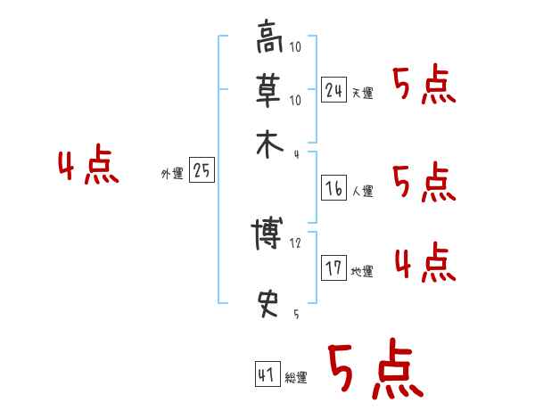 総運![]() | 高草木博史さんの総運は41画の5つ星!大志を抱き、目標に向かって実力を発揮し達成する。温和な性格。 あなたの人生を表す1番重要な運勢です。生涯を通じて影響する総合運となり、主に50歳以降の晩年期に影響を及ぼします。 |