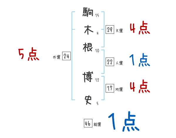 外運![]() | 駒木根博史さんの外運は24画の5つ星!家庭運が良く順調な人生。金運にも恵まれる。 生活面を象徴する運勢です。外部から受ける影響力を表し、結婚運、家庭運や職場、環境への順応性を表します。 |