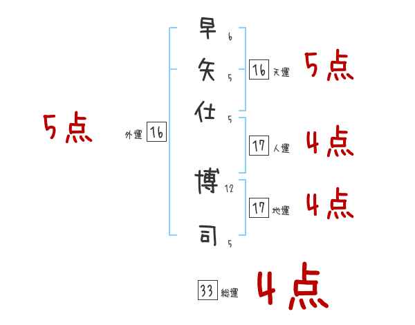 外運![]() | 早矢仕博司さんの外運は16画の5つ星!人望が厚く大きく発展する。逆転成功が見える。 生活面を象徴する運勢です。外部から受ける影響力を表し、結婚運、家庭運や職場、環境への順応性を表します。 |