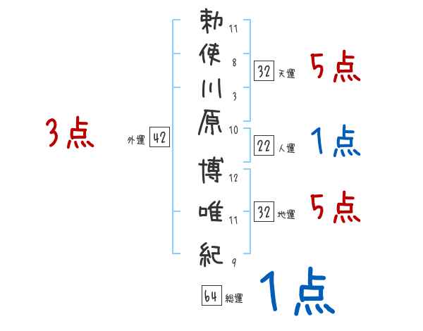 地運![]() | 勅使川原博唯紀さんの地運は32画の5つ星!柔軟性があり成功する。チャンスが多く金運が良い。 個性を表す基礎的な運勢です。性格形成や対人関係、行動力など家庭環境に影響されます。主に誕生してから20歳くらいまでの若年期の運勢を表します。 |
