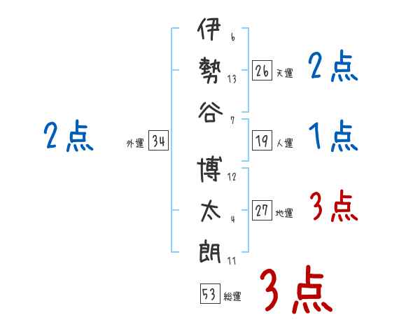 天運![]() | 伊勢谷博太朗さんの天運は26画の2つ星!波瀾万丈かも。信頼できる人を大事にしましょう。 家系が持つ宿命的な運勢を表します。祖先から受け継いだ苗字ですので自分の力が及びません。家柄を象徴します。 |