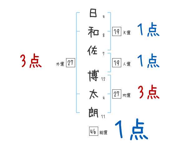 地運![]() | 日和佐博太朗さんの地運は27画の3つ星!頭脳明晰だが強情で摩擦が多い傾向。孤立に注意。 個性を表す基礎的な運勢です。性格形成や対人関係、行動力など家庭環境に影響されます。主に誕生してから20歳くらいまでの若年期の運勢を表します。 |