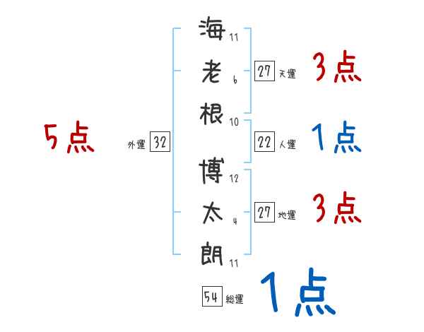外運![]() | 海老根博太朗さんの外運は32画の5つ星!柔軟性があり成功する。チャンスが多く金運が良い。 生活面を象徴する運勢です。外部から受ける影響力を表し、結婚運、家庭運や職場、環境への順応性を表します。 |