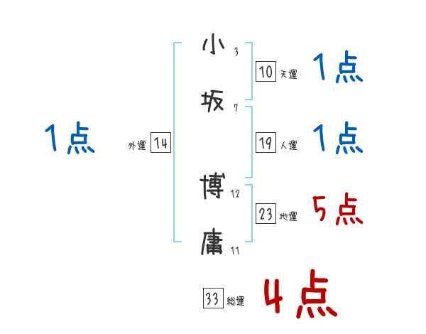 地運![]() | 小坂博庸さんの地運は23画の5つ星!想像力に優れ活力がある。一代で成功し名誉を手に入れる。 個性を表す基礎的な運勢です。性格形成や対人関係、行動力など家庭環境に影響されます。主に誕生してから20歳くらいまでの若年期の運勢を表します。 |
