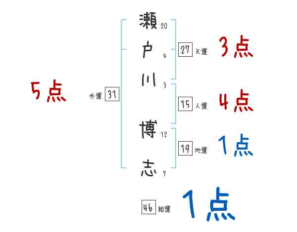 総運![]() | 瀬戸川博志さんの総運は46画の1つ星!迷走することが多く苦労するかも。目先のことにとらわれないように。 あなたの人生を表す1番重要な運勢です。生涯を通じて影響する総合運となり、主に50歳以降の晩年期に影響を及ぼします。 |