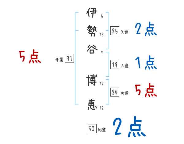 天運![]() | 伊勢谷博恵さんの天運は26画の2つ星!波瀾万丈かも。信頼できる人を大事にしましょう。 家系が持つ宿命的な運勢を表します。祖先から受け継いだ苗字ですので自分の力が及びません。家柄を象徴します。 |