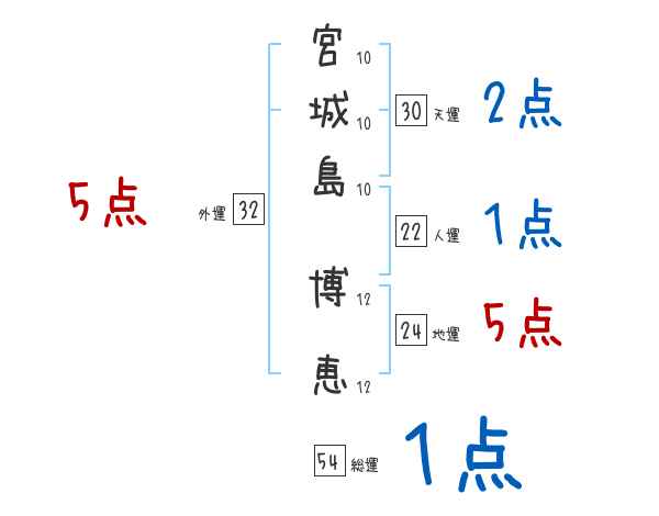 天運![]() | 宮城島博恵さんの天運は30画の2つ星!浮き沈みの激しさに注意しましょう。 家系が持つ宿命的な運勢を表します。祖先から受け継いだ苗字ですので自分の力が及びません。家柄を象徴します。 |