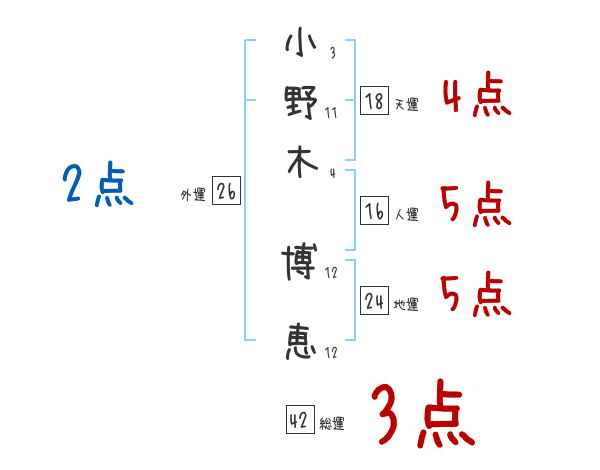 天運![]() | 小野木博恵さんの天運は18画の4つ星!情熱的で剛気。忍耐力があり信頼される。 家系が持つ宿命的な運勢を表します。祖先から受け継いだ苗字ですので自分の力が及びません。家柄を象徴します。 |