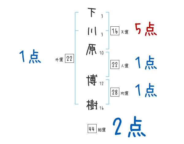 天運![]() | 下川原博樹さんの天運は16画の5つ星!人望が厚く大きく発展する。逆転成功が見える。 家系が持つ宿命的な運勢を表します。祖先から受け継いだ苗字ですので自分の力が及びません。家柄を象徴します。 |