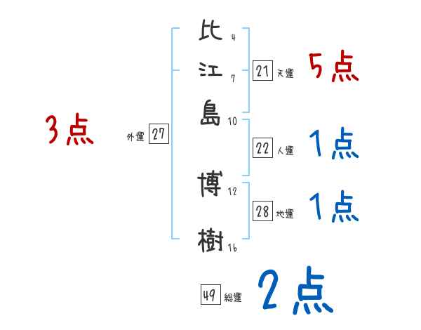 天運![]() | 比江島博樹さんの天運は21画の5つ星!統率力がある。独立し成功する。名誉を手に入れる。 家系が持つ宿命的な運勢を表します。祖先から受け継いだ苗字ですので自分の力が及びません。家柄を象徴します。 |