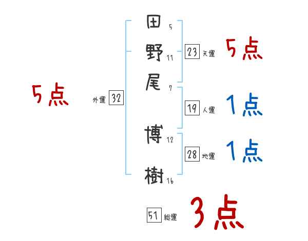 外運![]() | 田野尾博樹さんの外運は32画の5つ星!柔軟性があり成功する。チャンスが多く金運が良い。 生活面を象徴する運勢です。外部から受ける影響力を表し、結婚運、家庭運や職場、環境への順応性を表します。 |