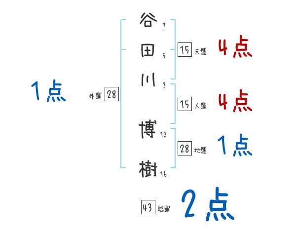地運![]() | 谷田川博樹さんの地運は28画の1つ星!家庭環境に注意。スポーツで活躍できる能力があるかも。 個性を表す基礎的な運勢です。性格形成や対人関係、行動力など家庭環境に影響されます。主に誕生してから20歳くらいまでの若年期の運勢を表します。 |