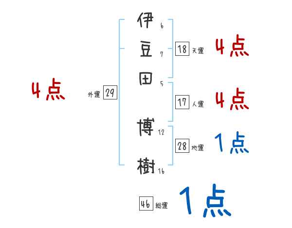 天運![]() | 伊豆田博樹さんの天運は18画の4つ星!情熱的で剛気。忍耐力があり信頼される。 家系が持つ宿命的な運勢を表します。祖先から受け継いだ苗字ですので自分の力が及びません。家柄を象徴します。 |