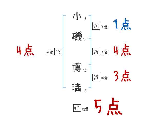 総運![]() | 小磯博満さんの総運は47画の5つ星!実力が開花し発展する円満な人生。財に恵まれる。 あなたの人生を表す1番重要な運勢です。生涯を通じて影響する総合運となり、主に50歳以降の晩年期に影響を及ぼします。 |