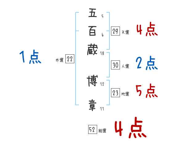 天運![]() | 五百蔵博章さんの天運は29画の4つ星!完全主義で才能がある。厳格な心の持ち主。 家系が持つ宿命的な運勢を表します。祖先から受け継いだ苗字ですので自分の力が及びません。家柄を象徴します。 |