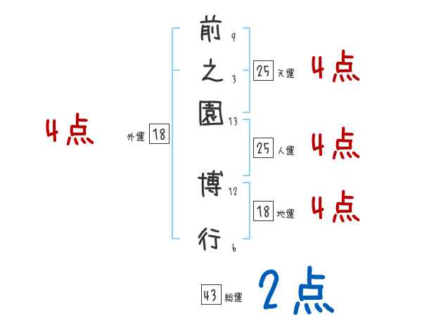総運![]() | 前之園博行さんの総運は43画の2つ星!頑固な性格で独立心が強いかも。やや非現実的で浪費に注意しましょう。 あなたの人生を表す1番重要な運勢です。生涯を通じて影響する総合運となり、主に50歳以降の晩年期に影響を及ぼします。 |