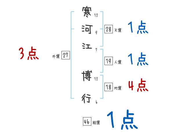 天運![]() | 寒河江博行さんの天運は28画の1つ星!家庭環境に注意。スポーツで活躍できる能力があるかも。 家系が持つ宿命的な運勢を表します。祖先から受け継いだ苗字ですので自分の力が及びません。家柄を象徴します。 |