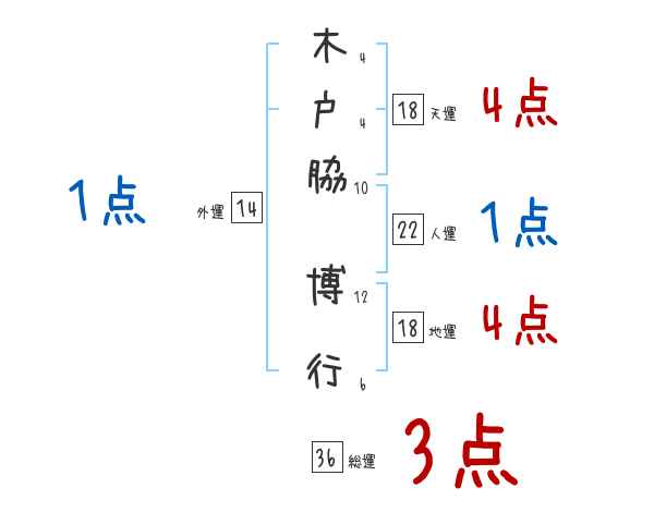 天運![]() | 木戸脇博行さんの天運は18画の4つ星!情熱的で剛気。忍耐力があり信頼される。 家系が持つ宿命的な運勢を表します。祖先から受け継いだ苗字ですので自分の力が及びません。家柄を象徴します。 |