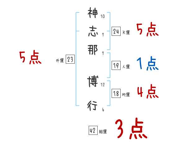 外運![]() | 神志那博行さんの外運は23画の5つ星!想像力に優れ活力がある。一代で成功し名誉を手に入れる。 生活面を象徴する運勢です。外部から受ける影響力を表し、結婚運、家庭運や職場、環境への順応性を表します。 |