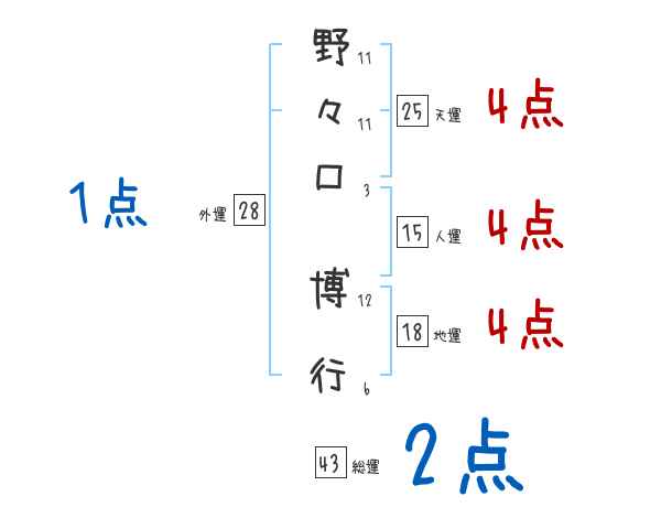 外運![]() | 野々口博行さんの外運は28画の1つ星!家庭環境に注意。スポーツで活躍できる能力があるかも。 生活面を象徴する運勢です。外部から受ける影響力を表し、結婚運、家庭運や職場、環境への順応性を表します。 |