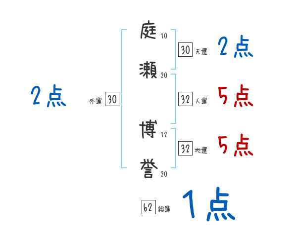 人運![]() | 庭瀬博誉さんの人運は32画の5つ星!柔軟性があり成功する。チャンスが多く金運が良い。 性格や才能などを表す2番目に重要な運勢です。人間関係や協調性、社会的な成功に影響します。主に20歳から50歳ぐらいまでの中年期の運勢を表します。 |
