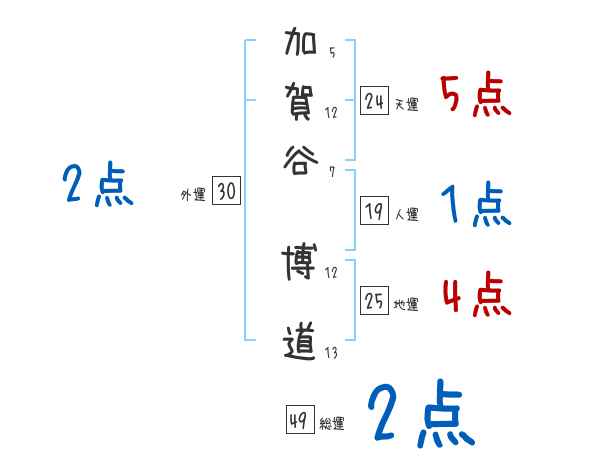 天運![]() | 加賀谷博道さんの天運は24画の5つ星!家庭運が良く順調な人生。金運にも恵まれる。 家系が持つ宿命的な運勢を表します。祖先から受け継いだ苗字ですので自分の力が及びません。家柄を象徴します。 |