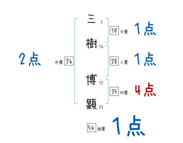 人運![]() | 三樹博顕さんの人運は28画の1つ星!家庭環境に注意。スポーツで活躍できる能力があるかも。 性格や才能などを表す2番目に重要な運勢です。人間関係や協調性、社会的な成功に影響します。主に20歳から50歳ぐらいまでの中年期の運勢を表します。 |