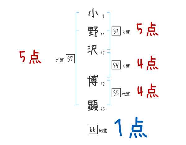 外運![]() | 小野沢博顕さんの外運は37画の5つ星!努力家で順応性に優れる。現実的な考え方ができ忠実に物事をこなす。 生活面を象徴する運勢です。外部から受ける影響力を表し、結婚運、家庭運や職場、環境への順応性を表します。 |