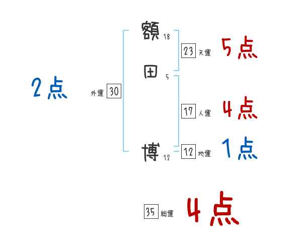 天運![]() | 額田博さんの天運は23画の5つ星!想像力に優れ活力がある。一代で成功し名誉を手に入れる。 家系が持つ宿命的な運勢を表します。祖先から受け継いだ苗字ですので自分の力が及びません。家柄を象徴します。 |