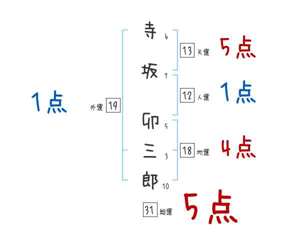 外運![]() | 寺坂卯三郎さんの外運は19画の1つ星!優れた才能を持ちますが、協調性が足りないことも。周りの人と協力する事を意識しましょう。 生活面を象徴する運勢です。外部から受ける影響力を表し、結婚運、家庭運や職場、環境への順応性を表します。 |