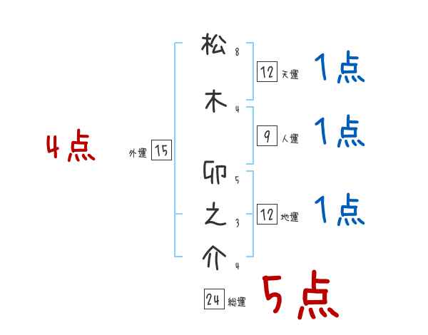 天運![]() | 松木卯之介さんの天運は12画の1つ星!簡単な失敗で諦めてしまいやすいかも。着実に行動すると良いでしょう。 家系が持つ宿命的な運勢を表します。祖先から受け継いだ苗字ですので自分の力が及びません。家柄を象徴します。 |