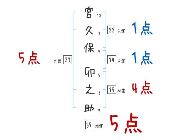 総運![]() | 宮久保卯之助さんの総運は37画の5つ星!努力家で順応性に優れる。現実的な考え方ができ忠実に物事をこなす。 あなたの人生を表す1番重要な運勢です。生涯を通じて影響する総合運となり、主に50歳以降の晩年期に影響を及ぼします。 |