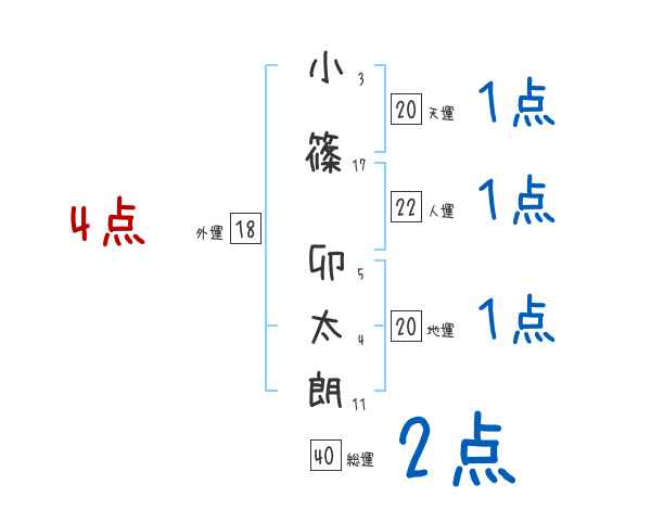 外運![]() | 小篠卯太朗さんの外運は18画の4つ星!情熱的で剛気。忍耐力があり信頼される。 生活面を象徴する運勢です。外部から受ける影響力を表し、結婚運、家庭運や職場、環境への順応性を表します。 |