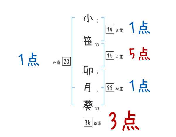 総運![]() | 小笹卯月葵さんの総運は36画の3つ星!先見性が豊かです。多少神経質で苦労することも。 あなたの人生を表す1番重要な運勢です。生涯を通じて影響する総合運となり、主に50歳以降の晩年期に影響を及ぼします。 |