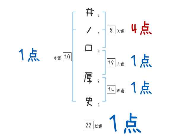 総運![]() | 井ノ口厚史さんの総運は22画の1つ星!努力することが苦手ないっぽう手先が器用。芸術性にも優れる。 あなたの人生を表す1番重要な運勢です。生涯を通じて影響する総合運となり、主に50歳以降の晩年期に影響を及ぼします。 |