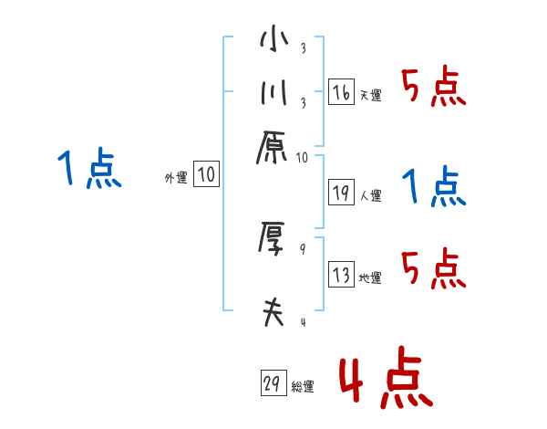 人運![]() | 小川原厚夫さんの人運は19画の1つ星!優れた才能を持ちますが、協調性が足りないことも。周りの人と協力する事を意識しましょう。 性格や才能などを表す2番目に重要な運勢です。人間関係や協調性、社会的な成功に影響します。主に20歳から50歳ぐらいまでの中年期の運勢を表します。 |