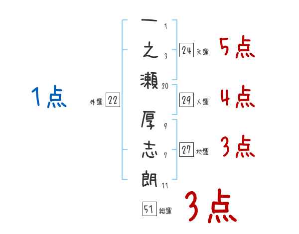 外運![]() | 一之瀬厚志朗さんの外運は22画の1つ星!努力することが苦手ないっぽう手先が器用。芸術性にも優れる。 生活面を象徴する運勢です。外部から受ける影響力を表し、結婚運、家庭運や職場、環境への順応性を表します。 |