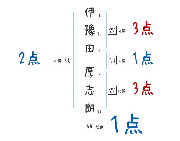 天運![]() | 伊豫田厚志朗さんの天運は27画の3つ星!頭脳明晰だが強情で摩擦が多い傾向。孤立に注意。 家系が持つ宿命的な運勢を表します。祖先から受け継いだ苗字ですので自分の力が及びません。家柄を象徴します。 |