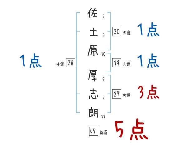 総運![]() | 佐土原厚志朗さんの総運は47画の5つ星!実力が開花し発展する円満な人生。財に恵まれる。 あなたの人生を表す1番重要な運勢です。生涯を通じて影響する総合運となり、主に50歳以降の晩年期に影響を及ぼします。 |