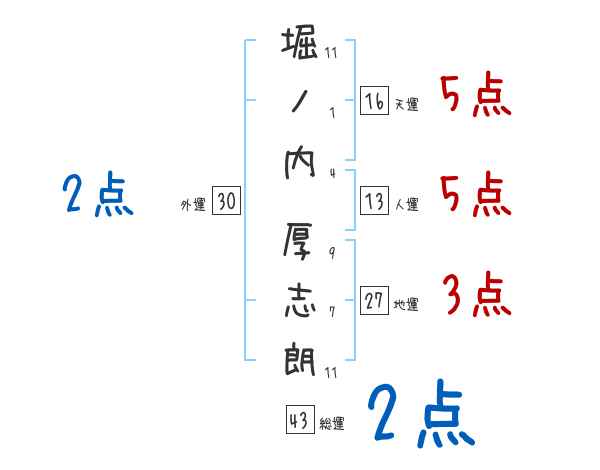 人運![]() | 堀ノ内厚志朗さんの人運は13画の5つ星!才能に恵まれ人気がある。名声を手に入れる。円満な人生。 性格や才能などを表す2番目に重要な運勢です。人間関係や協調性、社会的な成功に影響します。主に20歳から50歳ぐらいまでの中年期の運勢を表します。 |