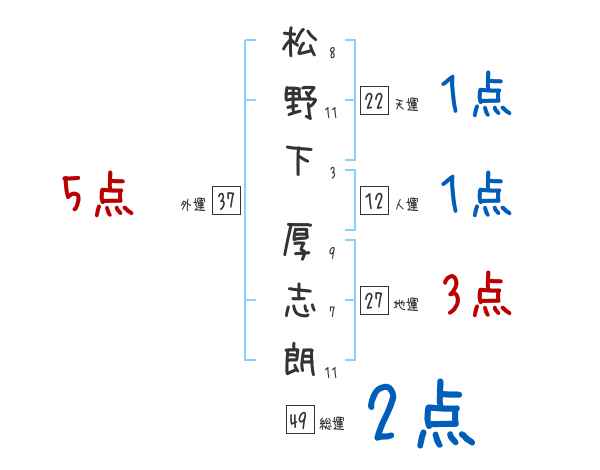 外運![]() | 松野下厚志朗さんの外運は37画の5つ星!努力家で順応性に優れる。現実的な考え方ができ忠実に物事をこなす。 生活面を象徴する運勢です。外部から受ける影響力を表し、結婚運、家庭運や職場、環境への順応性を表します。 |