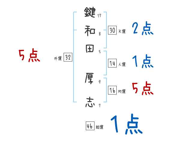 外運![]() | 鍵和田厚志さんの外運は32画の5つ星!柔軟性があり成功する。チャンスが多く金運が良い。 生活面を象徴する運勢です。外部から受ける影響力を表し、結婚運、家庭運や職場、環境への順応性を表します。 |